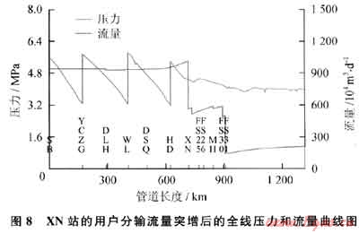 XN站的用戶分輸流量突增后的全線壓力和流量曲線圖如圖8所示。從圖8可以看出,當(dāng)XN站的分輸氣量突然增加后,XN站上下游的壓力會有所下降,上游的流量會有所增加。