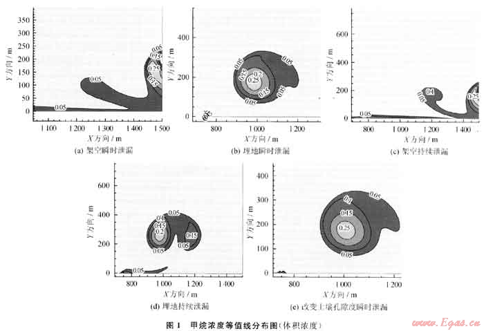 圖1為泄漏80s后甲烷濃度等值線分布。由圖可知:架空瞬時(shí)泄漏甲烷分布高濃度區(qū)擴(kuò)散至(1450m,200m)高空,分布不規(guī)則;埋地瞬時(shí)泄漏則分布在(1000m,150m)高空,呈圓形區(qū)域,在泄漏口有小范圍高濃度區(qū)。架空持續(xù)泄漏與架空瞬時(shí)泄漏分布曲線相似,但持續(xù)泄漏高濃度區(qū)向右下偏移。埋地持續(xù)濃度分布呈對(duì)稱結(jié)構(gòu),高濃度區(qū)內(nèi)存在左、右2個(gè)高濃度區(qū),近地面存在長250m、高20m的扁長狀爆炸區(qū)。增大土壤孔隙度后近地面無爆炸危險(xiǎn),濃度分布與埋地瞬時(shí)相似,但濃度降低。