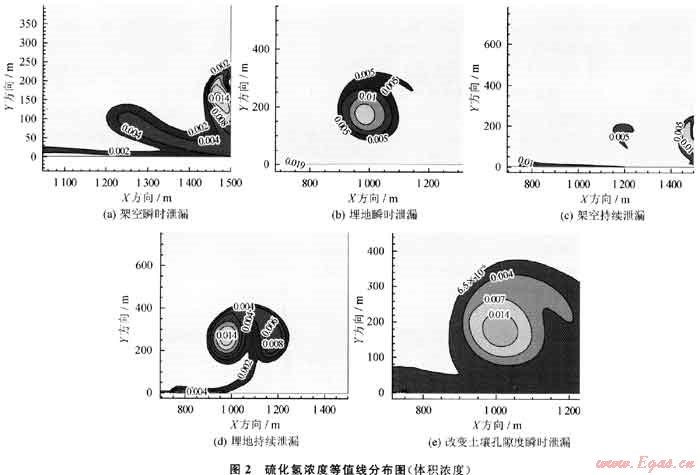 1) 氣體泄漏速度分布:X方向(水平方向)埋地管道泄漏(工況B、D、E)速度比架空管道(工況A、C)稍大,存在左偏的逆流區(qū);持續(xù)泄漏(工況C、D)速度等值線比架空瞬間右偏;埋地持續(xù)泄漏在左上和右下方存在2個(gè)速度較大區(qū);增大土壤孔隙度時(shí),速度等值線左偏。Y方向(豎直方向)瞬間泄漏(工況A、B、E)速度在左側(cè)存在逆流區(qū);埋地管道泄漏0速度線向左偏移;土壤孔隙度增大時(shí),等值線向左偏移;持續(xù)泄漏等值線呈近橢圓分布,不存在逆流區(qū)。