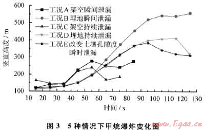 3) 管道泄漏爆炸范圍:埋地管道(工況B、D、E)泄漏爆炸范圍大且影響時(shí)間長,呈指數(shù)增加達(dá)到一定高度后不再升高,隨氣體擴(kuò)散濃度減低至爆炸下限外;架空瞬間及持續(xù)泄漏爆炸范圍在85s前增加且高度比埋地管道泄漏高,85s后降低;孔隙度越大其影響范圍越小。