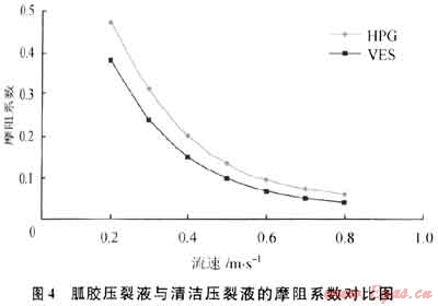 這種新型的溶液的結(jié)構(gòu)具有良好的可逆性,當高剪切時,結(jié)構(gòu)解體;剪切速率降低后,結(jié)構(gòu)又重新恢復。采用自研環(huán)路實驗裝置測定的流動摩阻如圖4所示:在同等條件下VES壓裂液摩阻系數(shù)比胍膠壓裂液低,有利于降低施工摩阻減小施工壓力。
