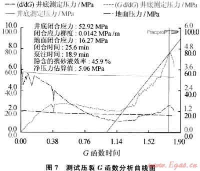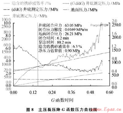 考慮該地區(qū)壓裂施工壓力普遍較高,故首先進行測試壓裂。測試壓裂實際入井液量55m3。測試壓裂G函數(shù)分析曲線見圖7。對測試壓力分別進行停泵壓力分析、壓降G函數(shù)分析和壓降雙對數(shù)分析以及平方根分析,井底閉合應力梯度14.3kPa/m,閉合時間25.6min,凈壓力4.6MPa。施工排量5.Om3/min時清潔壓裂液體系摩阻僅為清水摩阻的1/3,說明清潔壓裂體系摩阻比常規(guī)胍膠體系要小。