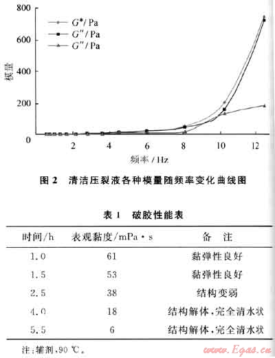采用控制應力流變儀測試該清潔壓裂液的彈性模量(G′)、黏性模量(G″)及復合模量(G*)情況如圖2所示,具有頻率敏感性。當剪切速率和溫度恒定時,壓裂液的G′、G″、G*以及表觀黏度均保持恒定;在不同的頻率下,體系的儲能模量始終大于損耗模量,屬彈體流體。可見該體系具有良好黏彈性、抗剪切穩(wěn)定性、攜砂性能。