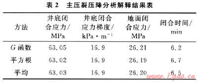 對主壓裂分別進行停泵壓力分析、壓降G函數(shù)分析和壓降雙對數(shù)分析以及平方根分析,井底閉合應力梯度為16.9kPa/m,地面閉合壓力為26.2MPa,閉合時間為6.5min(表2)。