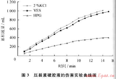 采用巖心流動實驗裝置評價該壓裂液對巖心的傷害,其狀況如圖3所示。胍膠壓裂液破膠液在通過API導流槽時,由于破膠液中存在殘渣,使累計體積隨時間的增長越來越慢,最后漸漸地趨向于零,傷害嚴重。而所研制的VES壓裂液破膠液通過API導流槽時,表現(xiàn)出了與2%KCl溶液相似的流動特性,該壓裂液對支撐裂縫帶的傷害非常小。