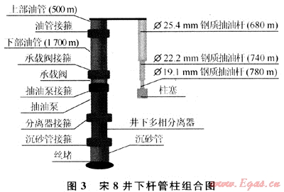該井井下配套裝置采用前述Ф44mm防腐防氣整筒式金屬柱塞泵、組合式井下高效多相分離器、承載閥裝置。井下桿管柱結(jié)構(gòu)經(jīng)過優(yōu)化設(shè)計(jì),在現(xiàn)有抽油機(jī)條件下,采用Ф25.4mm×820m+Ф22.2mm×800m+Ф19.1mm×700m的D級(jí)抽油桿方案(圖3)。但由于機(jī)抽井少,桿柱調(diào)節(jié)困難,仍采用原井桿柱(即泵掛2200m),且由于配套抽油桿短節(jié)缺失,上部Ф25.4mm抽油桿與光桿之間采用臨時(shí)加工的普通平扣短節(jié)代替。