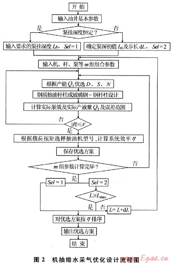 根據(jù)排水采氣井的地質(zhì)資料、生產(chǎn)數(shù)據(jù)、測井資料等數(shù)據(jù),在目前較為成熟的理論研究成果的基礎(chǔ)上,通過進(jìn)一步對(duì)機(jī)抽井的理論研究工作,研制出了“機(jī)抽排水采氣系統(tǒng)優(yōu)化設(shè)計(jì)軟件”。該軟件分為機(jī)抽井校核、機(jī)抽井設(shè)計(jì)、轉(zhuǎn)抽井設(shè)計(jì)、機(jī)抽井管理、機(jī)抽井診斷、實(shí)測系統(tǒng)效率計(jì)算、軟件幫助7大子系統(tǒng)[4~5]。應(yīng)用該軟件,在供排協(xié)調(diào)條件下對(duì)機(jī)一桿一泵系統(tǒng)進(jìn)行優(yōu)化設(shè)計(jì)與參數(shù)、設(shè)備等的優(yōu)選,其優(yōu)化設(shè)計(jì)流程如圖2所示。