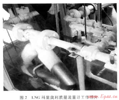LNG流量計是整個LNG加氣機的核心部件。流量計的選型直接影響LNG加氣機的性能。根據(jù)以往石油和天然氣貿易交接應用中所用的流量計量方法,最合理的LNG流量測量計包括:差壓(孔板式)流量計、渦輪流量計、超聲波流量計和科里奧利質量流量計,其中差壓流量計和渦輪流量計是得到公認的傳統(tǒng)技術,但用其來測量低溫的LNG時卻存在一些困難:差壓裝置和渦輪流量計都會使流量管內的壓力大大降低,這可能導致LNG氣化;差壓流量計還要求管道上游和下游為長距離直線型布局,計量的流量范圍不廣。而超聲波流量計和科里奧利質量流量計被視為新技術,得到了美國石油學會(API)、美國天然氣協(xié)會(AGA)和國際法制計量組織(OIML)的認可,但在LNG貿易交接過程中使用超聲波流量計仍存在一些問題,而科里奧利質量流量計是目前應用最成功的LNG流量計。圖2所示的即為使用中的LNG科里奧利質量流量計。目前,美國艾默生旗下的高準公司生產的CMF系列質量流量計和Endress+Hauser公司生產的83F低溫型質量流量計以其耐低溫和性能穩(wěn)定的優(yōu)點得到了LNG加氣機行業(yè)的認同。但是,LNG加氣機在加液過程中難免會發(fā)生LNG的部分氣化,氣液兩相的存在對科里奧利質量流量計的計量精度影響很大,其中氣相流量計量的準確性對加氣機計量精度有著至關重要的影響,目前科里奧利質量流量計液相計量的精度可達±0.10%,而氣相計量的精度只有±0.35%,這是需要進一步解決的技術難題[4]。
