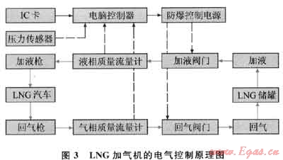 4) 在整個加氣過程中,質量流量計測出流經LNG加氣機的流體密度和質量等參數(shù)的物理信號,由信號轉換器轉換成電脈沖信號傳送到控制器,LNG加氣機上的壓力傳感器和控制器可以將LNG加氣機的工作狀態(tài)傳輸給LNG加氣站服務器,使其對整個加氣過程進行監(jiān)控,自動完成加氣工作。