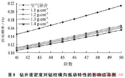 由于鉆井液的存在,鉆柱在進(jìn)行軸向運(yùn)動(dòng)的時(shí)候,受到鉆井液的黏滯作用。根據(jù)鉆井液的流變特性,其密度越高,黏度越大,對(duì)鉆柱軸向運(yùn)動(dòng)的阻礙作用越明顯??梢?jiàn),鉆井液會(huì)對(duì)鉆柱縱向振動(dòng)的固有頻率產(chǎn)生很大影響,改變縱向振動(dòng)的臨界轉(zhuǎn)速,這種影響必須引起足夠的重視。