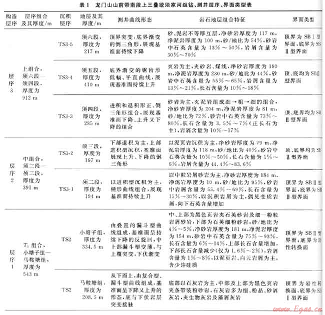 過去習慣上把上三疊統(tǒng)劃分為6段,其中一、三、五段為頁巖夾可采煤層的煤系地層,稱為富煤段;二、四、六段為砂巖,是富砂段也是含油氣的儲集層。據(jù)3條SBⅠ型層序界面劃分了3套構造層序,據(jù)SBⅡ型層序界面和水泛面劃分了6套沉積層序(S01~S06),在層序內(nèi)識別了巖性轉(zhuǎn)換面,據(jù)此建立了上三疊統(tǒng)的層序地層剖面(圖1),須家河組各層序鉆、測井層序、界面類型見表1。
