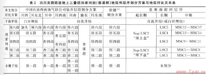由于控制四川盆地構(gòu)造-沉積格局的龍門山和米倉(cāng)山-大巴山兩條造山帶逆沖推覆活動(dòng)的非同步性和異方位性[5~6],須家河期的沉積充填作用于盆地各部位也是不同步和非均衡的,在地層表現(xiàn)形式上,如地層厚度、巖性、巖相、疊置方式和物源供給方向都存在很大的差異性,致使盆地范圍內(nèi)須家河組很難進(jìn)行統(tǒng)一地層劃分和區(qū)域?qū)Ρ取5罁?jù)上述各次級(jí)構(gòu)造單元須家河組層序發(fā)育特征,筆者采用高分辨率層序地層學(xué)理論和層序分析與對(duì)比技術(shù)[19],從盆-山耦合過程的構(gòu)造-沉積序列分析和旋回等時(shí)對(duì)比法則入手,在對(duì)各次級(jí)構(gòu)造單元須家河組進(jìn)行層序劃分和發(fā)育特征描述的基礎(chǔ)上,建立貫穿盆地的層序 地層和時(shí)間-地層格架,從層序演化規(guī)律和旋回等時(shí)性分析角度出發(fā),對(duì)須家河組進(jìn)行了更為合理的統(tǒng)一劃分和區(qū)域地層對(duì)比取得較好效果(表2),也為編制須家河組更精細(xì)的層序-巖相古地理圖[16]和描述層序充填樣式與氣藏分布關(guān)系[20]提供了更為有效的基礎(chǔ)資料。