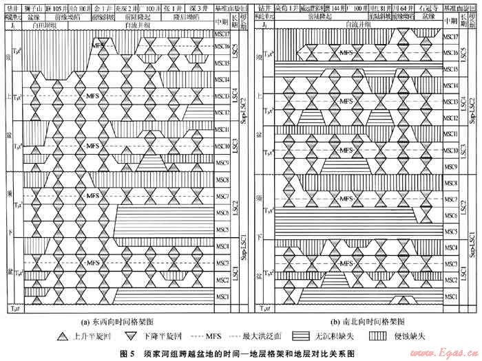 4) 在時(shí)間-地層格架中(圖5-a)各超長(zhǎng)期、長(zhǎng)期旋回的層序界面自西向東,由川西坳陷經(jīng)川中前陸隆起至川東南坳陷具有逐漸加大的上超穿時(shí)性,相關(guān)的中期旋回發(fā)育數(shù)量也依次減少,而最大洪泛面具有良好的等時(shí)性,洪泛面兩側(cè)的中期旋回均有保存。因此,由最大洪泛期沉積的泥巖段成為區(qū)域地層劃分和等時(shí)對(duì)比的依據(jù)。