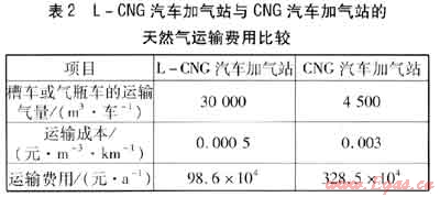由于加氣站總運(yùn)營費(fèi)用的90%以上是用于購買和運(yùn)輸天然氣,因此從氣源點到加氣站的運(yùn)輸成本對加氣站的運(yùn)行費(fèi)用產(chǎn)生很大影響,進(jìn)而影響加氣價格。L-CNG汽車加氣站與CNG汽車加氣站的天然氣運(yùn)輸費(fèi)用比較見表2。