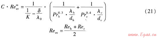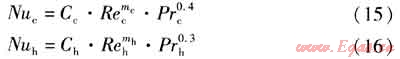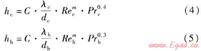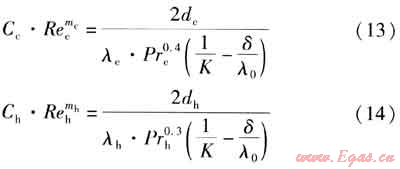 修正威爾遜法的適用條件之一為:在測試時須保持一側(cè)流體的流速不變,而變化另一側(cè)的流速。由于冷熱流體流速不同,其雷諾數(shù)相差較大,因此冷熱兩側(cè)不能采用相似的傳熱準(zhǔn)則方程描述,即冷熱兩側(cè)準(zhǔn)則方程中的C、m應(yīng)分別求取。冷熱兩側(cè)的傳熱準(zhǔn)則方程分別為:
