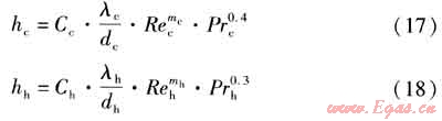 式中hc、hh——冷、熱側(cè)表面?zhèn)鳠嵯禂?shù),W/(m2·K)