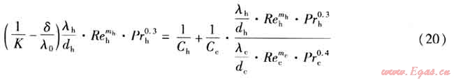 修正威爾遜法的計算前提是必須已知一側(cè)傳熱準(zhǔn)則方程的待求指數(shù),將等流速法計算得到的m作為熱側(cè)待求指數(shù)mh,設(shè)定初值C′h=Ch,這樣即可求出熱側(cè)表面?zhèn)鳠嵯禂?shù)hh,由式(6)、(17)整理得: