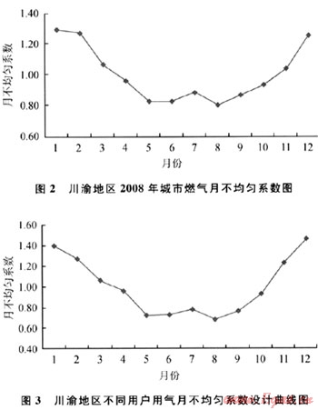 根據(jù)GB 50028—2006《城鎮(zhèn)燃?xì)庠O(shè)計(jì)規(guī)范》,月不均勻系數(shù)指計(jì)算月的日平均用氣量和年的日平均用氣量之比。應(yīng)根據(jù)用戶前幾年逐月的用氣情況進(jìn)行統(tǒng)計(jì),計(jì)算用戶的月不均勻系數(shù),同時(shí)在設(shè)計(jì)時(shí)充分預(yù)留,以便保障用氣高峰時(shí)期的供氣平穩(wěn)性和安全性。圖2為川渝地區(qū)2008年城市燃?xì)庠虏痪鶆蛳禂?shù)圖,圖3為川渝地區(qū)不同用戶用氣月不均勻系數(shù)設(shè)計(jì)曲線圖。由圖2、3可知,川渝地區(qū)2008年的最大月不均勻系數(shù)為1.25,為了保障安全,設(shè)計(jì)取值為1.50[7]。