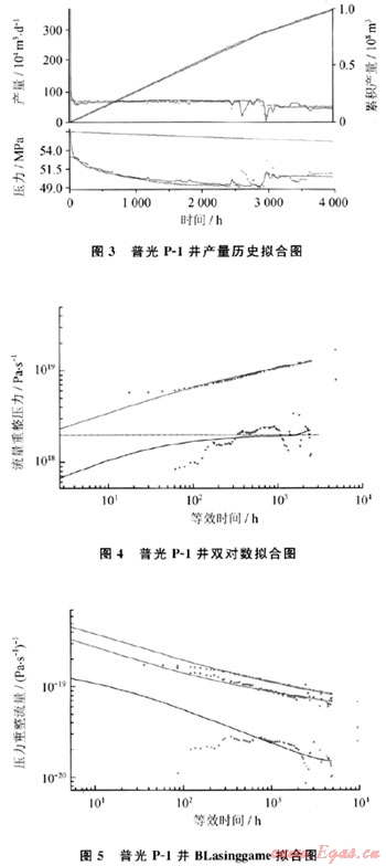 收集了普光P-1井投產(chǎn)后的測試數(shù)據(jù),其中井口數(shù)據(jù)包括井口油壓、產(chǎn)量、溫度以及實(shí)際日產(chǎn)水量,井下測試數(shù)據(jù)包括井底流壓、井底溫度,累計(jì)224d的數(shù)據(jù)。并采用試井分析軟件對(duì)數(shù)據(jù)進(jìn)行資料解釋研究[4~6],從雙對(duì)數(shù)擬合圖上看,曲線沿1/4攀升,具有裂縫特征。因此數(shù)據(jù)分析解釋模型采用:有限導(dǎo)流+均質(zhì)氣藏+圓形邊界。曲線擬合較好,解釋結(jié)果為:初始?jí)毫?6.6MPa,平均有效滲透率0.197mD,地層系數(shù)62.36mD·m,裂縫半長62.2m,探測半徑797.7m(圖3~5)。