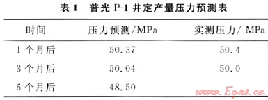同時(shí)在資料解釋后按定產(chǎn)量的方式進(jìn)行預(yù)測。保持產(chǎn)量在47.9×104m3/d不變的情況下,生產(chǎn)1個(gè)月、3個(gè)月、6個(gè)月后進(jìn)行壓力預(yù)測,井底壓力分別下降至50.37MPa、50.04MPa、48.50MPa,與生產(chǎn)后實(shí)測壓力基本吻合,其預(yù)測結(jié)果見表1。
