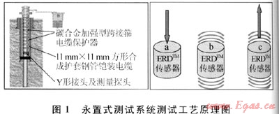 永置式測試系統(tǒng)工作原理是地面系統(tǒng)通過井下電纜給傳感器提供一個(gè)毫伏級(jí)的電壓信號(hào),ERD傳感器產(chǎn)生與周圍環(huán)境壓力及溫度相關(guān)的頻率響應(yīng)信號(hào),頻率響應(yīng)信號(hào)再通過電纜傳送至地面采集系統(tǒng)被轉(zhuǎn)為壓力溫度讀數(shù)。