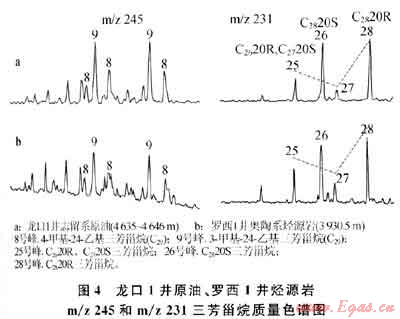 油氣源對比表明龍口1井志留系原油與羅西1井中奧陶統(tǒng)烴源巖在三芳甾烷的分布上具有相似的特征,如圖4所示。
