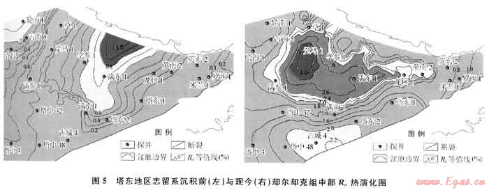 通過熱演化史分析,塔東地區(qū)卻爾卻克組烴源巖熱演化差異較大(圖5)。