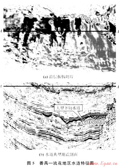 該區(qū)目前無鉆井鉆遇到該地質(zhì)體,但在該區(qū)東部,其水下水道的地震特征非常明顯:利用最新采集的3D地震資料,以精細的3D地震資料做基礎(chǔ),能夠清晰地觀察到水道的侵蝕、平面分布等特征。通過分析,發(fā)現(xiàn)了8條水道(圖5中①~⑧),自西向東依次排列,由北向南延伸,隨著坡度的逐漸減緩,在河道下方分別演化為扇狀朵體,并相互疊置(圖5-a)。這些水道在不同位置,其形態(tài)、寬度、長度都不同,但具有相似的地震相特征:地震同相軸呈點、段式反射,下切特征明顯,振幅中等-高(圖5-b)。通過這些水道下切形態(tài)、深度、地震反射特征和沉積厚度,可推測其形成于同一時期,且物源均來自于正北方向。