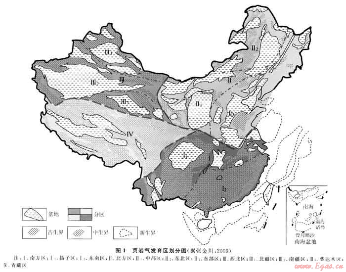 據(jù)估算,中國頁巖氣可采資源量大約為31×1012m3[2]。估算結(jié)果表明,南方、北方、西北及青藏地區(qū)各自占中國頁巖氣可采資源總量的46.8%、8.9%、43%和1.3%,古生界、中生界和新生界各自占中國頁巖氣資源總量的66.7%、26.7%和6.6%[3~4]。