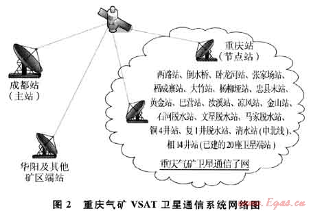 3) 對(duì)于新納入到重慶輸氣管網(wǎng)SCADA系統(tǒng)進(jìn)行監(jiān)控的站場(chǎng)(如地處偏遠(yuǎn)且公網(wǎng)難以到達(dá)的重要站場(chǎng))采用VSAT衛(wèi)星系統(tǒng)數(shù)據(jù)傳輸電路作為重慶輸氣管網(wǎng)SCADA系統(tǒng)數(shù)據(jù)傳輸主通道,GPRS數(shù)據(jù)傳輸作為SCADA系統(tǒng)備用數(shù)據(jù)傳輸通道。重慶氣礦VSAT衛(wèi)星通信系統(tǒng)網(wǎng)絡(luò)圖如圖2所示。