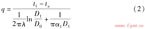 忽略管道的導(dǎo)熱熱阻、燃?xì)馀c管道內(nèi)表面對(duì)流換熱的熱阻,得到公式(2)[4]。