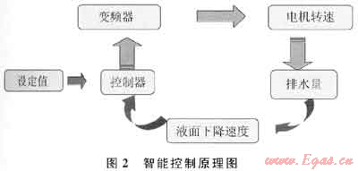智能控制系統(tǒng)由地面部分和井下部分組成。通過(guò)采集井下壓力計(jì)或地面流量計(jì)信號(hào),根據(jù)煤層氣單井排采規(guī)律,地面人工預(yù)先設(shè)定井底流壓變化值,由智能控制系統(tǒng)自動(dòng)閉環(huán)控制排采系統(tǒng)的工作參數(shù)(電機(jī)轉(zhuǎn)速或頻率),實(shí)現(xiàn)了井底流壓的智能控制。其控制原理如圖2所示。