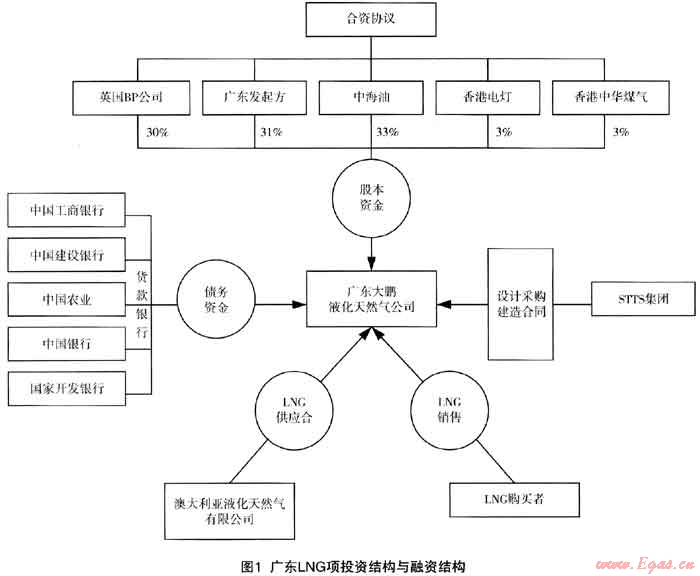 廣東LNG項(xiàng)目采用的是公司型合資結(jié)構(gòu)(Incorporated Joint Venture),投資者根據(jù)合資協(xié)議認(rèn)購(gòu)合資公司即項(xiàng)目公司股份。項(xiàng)目公司各發(fā)起方和投資者的持股比例為:中海油33%,廣東發(fā)起方31%(深圳市投資管理公司14%,廣東省電力集團(tuán)公司6%,廣州市煤氣公司6%,東莞市燃料工業(yè)總公司2.5%和佛山市燃?xì)饪偣?.5%),英國(guó)BP公司30%,香港電燈集團(tuán)有限公司3%和香港中華煤氣有限公司3%。項(xiàng)目公司將作為L(zhǎng)NG的總買方購(gòu)買LNG,同時(shí)向各電廠和城市燃?xì)獾扔脩翡N售管道天然氣。