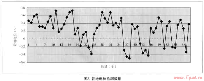對(duì)整體管道的自然電位測(cè)試和原犧牲陽(yáng)極保護(hù)系統(tǒng)進(jìn)行測(cè)試,大部分管道處在自然腐蝕電位狀態(tài)(-0.45v,Cu/CuS04參比電極),所測(cè)的60處管地電位在-0.49V~-0.72V之間波動(dòng)(見圖3),其中正值占77%,最負(fù)值-0.49V,達(dá)不到管道陰極保護(hù)電位(即管/地界面極化電位)要求的-0.85V,即管道運(yùn)行沒有處于陰極保護(hù)狀態(tài)。