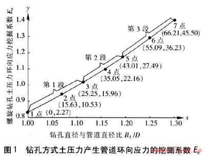 應用上述曲線函數(shù)關(guān)系,通過VB軟件可編制出圖形查值軟件,仍以本應用實例進行說明。已知鉆孔直徑與管道直徑比Bd/D值(例如Bd/D=1.228),通過圖形對應比例關(guān)系,軟件程序計算出與Bd/D值相對應的x值。根據(jù)x值,軟件程序自動判定此x值所在曲線段數(shù),依據(jù)該段曲線函數(shù)關(guān)系式,求出相應的y值。根據(jù)y值,依據(jù)圖形對應比例關(guān)系,軟件程序計算出與其相對應的螺旋鉆孔土壓力環(huán)向應力挖掘系數(shù)Ee值(Ee=1.24)。