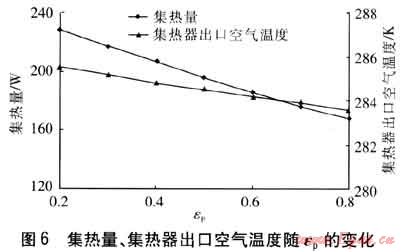 保持其他參數(shù)不變,集熱量、集熱器出口空氣溫度隨εp的變化見圖6。由圖6可知,隨著εp增大,吸熱板對(duì)環(huán)境的輻射傳熱增強(qiáng),熱損失增大,集熱量降低。由于吸熱板溫度降低,與空氣的對(duì)流傳熱減弱,因此集熱器出口空氣溫度降低。集熱量與集熱器出口空氣溫度降低的趨勢(shì)逐漸減緩,這是由于隨著吸熱板溫度的降低,熱損失的增長率也大大降低。