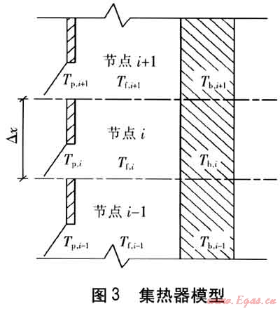 集熱器模型見圖3,基于有限差分的數(shù)值解法,將集熱器沿x方向分成n個(gè)節(jié)點(diǎn)。