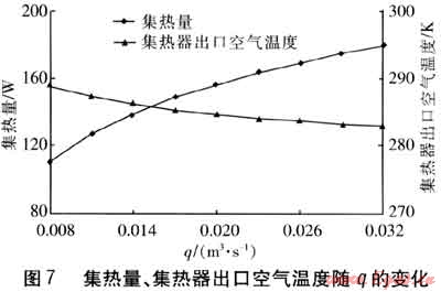 保持其他參數(shù)不變,集熱量、集熱器出口空氣溫度隨q的變化見圖7。由圖7可知,隨著q的增大,集熱器出口空氣溫度降低,這是由于q的增大易導(dǎo)致空氣穿過吸熱板的時(shí)間和在集熱器內(nèi)部流動(dòng)的時(shí)間縮短,影響了換熱效果。然而,集熱量一方面取決于集熱器出口空氣溫度與環(huán)境溫度之差,另一方面取決于q。由圖7可知,當(dāng)q增大時(shí),集熱器出口空氣溫度降低幅度較小,此時(shí)q成為影響集熱量的決定因素。因此隨q的增大,集熱量逐漸升高。但在集熱器出口空氣溫度逐漸減小的影響下,集熱量的增長速率是逐漸減緩的。
