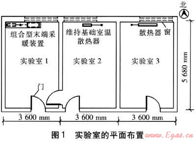 在天津市某高校3間尺寸均為3600mm×5680mm×3600mm(寬×進(jìn)深×高)的實驗室中進(jìn)行了實驗研究,3間實驗室的采暖裝置分別是組合型末端采暖裝置、維持基礎(chǔ)室溫的散熱器及滿足熱負(fù)荷要求的散熱器。實驗室的平面布置見圖1,圍護(hù)結(jié)構(gòu)特性參數(shù)見表1。對散熱器、供暖型風(fēng)機盤管、組合型末端采暖裝置3種采暖方式進(jìn)行實驗研究。