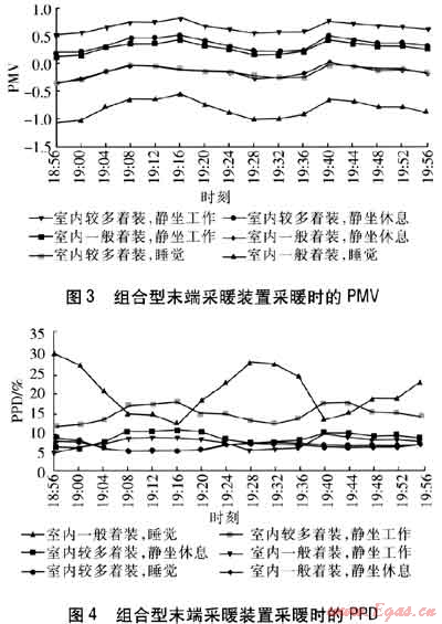 在實驗室1中,采用組合型末端采暖裝置進(jìn)行采暖,開啟供暖型風(fēng)機盤管的風(fēng)機中檔后進(jìn)行測試。當(dāng)CLO=1.0時,當(dāng)人員靜坐休息時,PMV的平均值為0.31,PPD的平均值為7.26%,滿足IS0 7730—2005對可接受熱環(huán)境的規(guī)定,即室內(nèi)熱環(huán)境滿足大部分人的舒適要求。靜坐工作時,PMV的平均值為0.63,PPD的平均值為13.38%,人們需將較多著裝變?yōu)橐话阒b(CLO=0.7)。變?yōu)橐话阒b后,靜坐工作時PMV的平均值為0.28,PPD的平均值為6.87%;靜坐休息時PMV的平均值為-0.04,PPD的平均值為5.20%。此時靜坐工作和靜坐休息時的熱環(huán)境均符合IS0 7730—2005對可接受熱環(huán)境的規(guī)定。可見采用組合型末端采暖裝置采暖,既符合人們的日常行為習(xí)慣,又提升了人們的生活品質(zhì)。通過對幾年實測數(shù)據(jù)的分析,建議采用組合型末端采暖裝置時,在進(jìn)行維持基礎(chǔ)室溫所需的散熱器面積計算時,散熱器的散熱量宜取該房間室內(nèi)采暖設(shè)計熱負(fù)荷的40%。組合型末端采暖裝置采暖時的PMV、PPD分別見圖3、4。