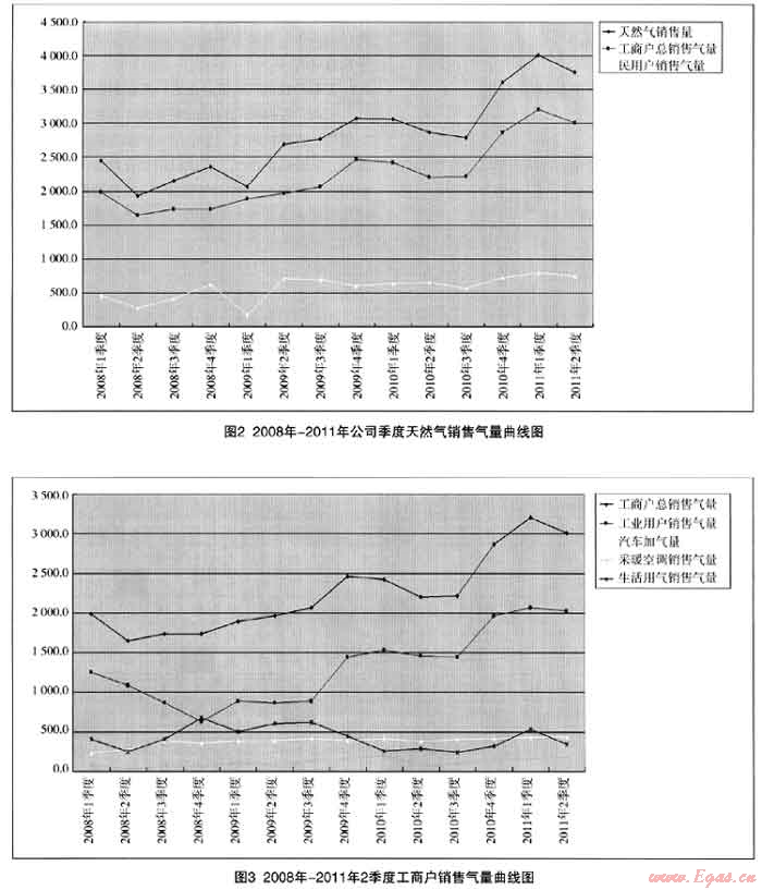 圖2中3條線分別代表公司天然氣總銷售量、工商戶銷售氣量及民用戶銷售氣量。