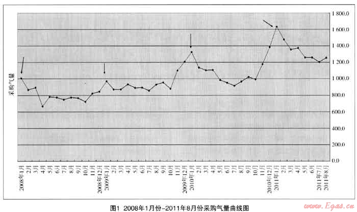 表1 2008年1月至2011年8月天然氣采購氣量表    單位:萬m3
