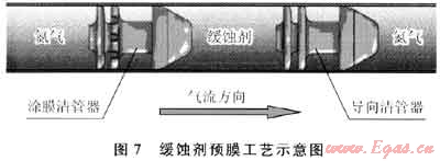 緩蝕劑預(yù)膜采用預(yù)膜型緩蝕劑與柴油按照1:1比例混合,用預(yù)膜球進(jìn)行作業(yè),合理運(yùn)行速度控制緩蝕劑與管道內(nèi)壁接觸時(shí)間在5~10s,保證緩蝕劑在管道內(nèi)壁形成3~4mil(1mil=25.39999918μm)的緩蝕劑化學(xué)膜,預(yù)膜工藝見圖7。目前按照30~60d的頻次進(jìn)行緩蝕劑涂膜。