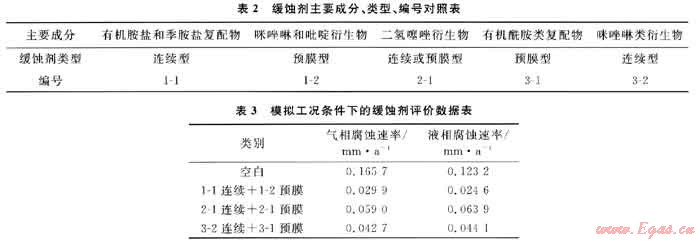 針對國外高含硫氣田已成熟應(yīng)用的商業(yè)產(chǎn)品,結(jié)合普光氣田濕氣集輸工藝的腐蝕特點(diǎn),選取了連續(xù)型和預(yù)膜型2種類型緩蝕劑。根據(jù)緩蝕劑在高含硫介質(zhì)條件下的成膜特性,優(yōu)選了有機(jī)胺鹽和季胺鹽復(fù)配物、咪唑啉和吡啶衍生物、二氫噻唑衍生物、有機(jī)酰胺類復(fù)配物、咪唑啉類衍生物共5類緩蝕劑產(chǎn)品,具體類型見表2。