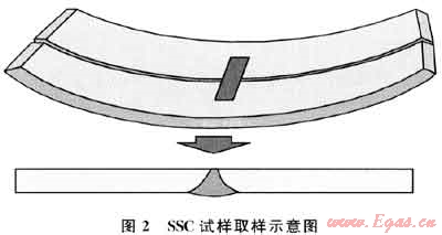 硫化物應(yīng)力開裂(SSC)試件尺寸:115×15×5(5為壁厚方向)(mm),焊接接頭試樣垂直于焊縫取樣,焊縫位于試樣中部。對于焊接管,應(yīng)從焊縫、沿焊縫90°、180°部位取樣。以內(nèi)壁為基準(zhǔn)取5mm厚的試樣,圖2為SSC試件取樣示意圖。