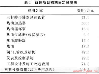 根據目前崖城氣田使用的相關設備的市場價格,可以估算出整個改造項目的初期投資費用為305.5萬元,改造項目初期固定投資列表見表1。