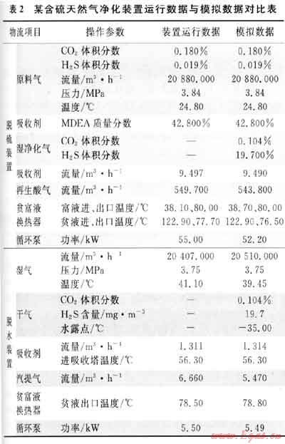 依據(jù)該含硫天然氣凈化裝置的運行數(shù)據(jù),將原料氣及MDEA吸收溶液的參數(shù)輸入凈化裝置工藝模型,調(diào)整模型參數(shù),使輸出干氣氣質(zhì)達到凈化氣氣質(zhì)標準。表2為某含硫天然氣凈化裝置運行數(shù)據(jù)與模擬數(shù)據(jù)對比表,據(jù)此來驗證所建立的凈化裝置模型的準確性。