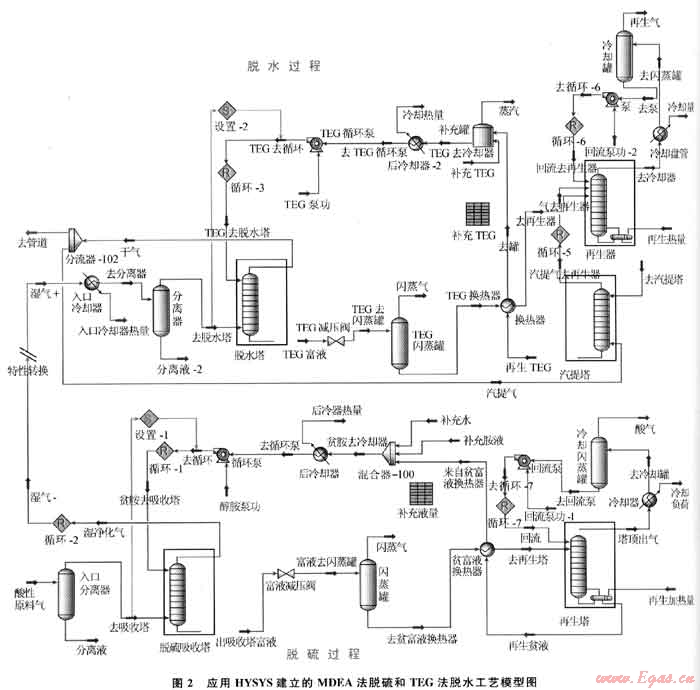 基于該天然氣凈化裝置的工藝流程,應(yīng)用HYSYS流程模擬軟件建立脫硫、脫水裝置的工藝模型。圖2為應(yīng)用HYSYS建立的MDEA法脫硫和TEG法脫水裝置工藝模型圖。