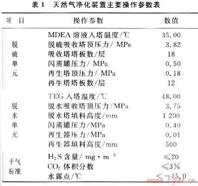 川渝地區(qū)某50×104m3/d天然氣凈化裝置采用典型的甲基二乙醇胺(MDEA)溶液吸收法脫除原料氣中的酸氣(主要為H2S和C02)成分,用三甘醇(TEG)溶液吸收法脫除水分,降低天然氣的露點。原料氣的組成為:CH4體積分數(shù)為95.100%,C2H6體積分數(shù)為2.122%,C3H8體積分數(shù)為0.431%,C4H10體積分數(shù)為0.123%,C5H12體積分數(shù)為0.032%,C02體積分數(shù)為0.180%,H2S體積分數(shù)為1.900%,N2體積分數(shù)為0.112%,H2O為飽和狀態(tài)。圖1為該天然氣凈化裝置的工藝流程簡圖。表1為該天然氣凈化裝置的主要操作參數(shù)及干氣質(zhì)量標準。