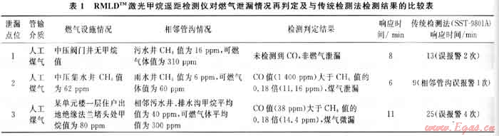 當(dāng)車載式0MDTM光學(xué)甲烷探測儀甲烷值超標(biāo)報(bào)警后(設(shè)定為20ppm),可用RMLDTM激光甲烷遙距檢測儀檢測在報(bào)警30m范圍內(nèi)的燃?xì)庠O(shè)施和相鄰管溝的CH4值,確定泄漏源,調(diào)頻后再檢測C0值(無管溝不需檢測),若C0值大于CH4值的0.18倍,則可判定為煤氣泄漏所致。表1是對該城市1條在役管線及支線用RMLDTM檢測儀進(jìn)行的燃?xì)庑孤┣闆r再判定及與傳統(tǒng)檢測法檢測結(jié)果的比較表。